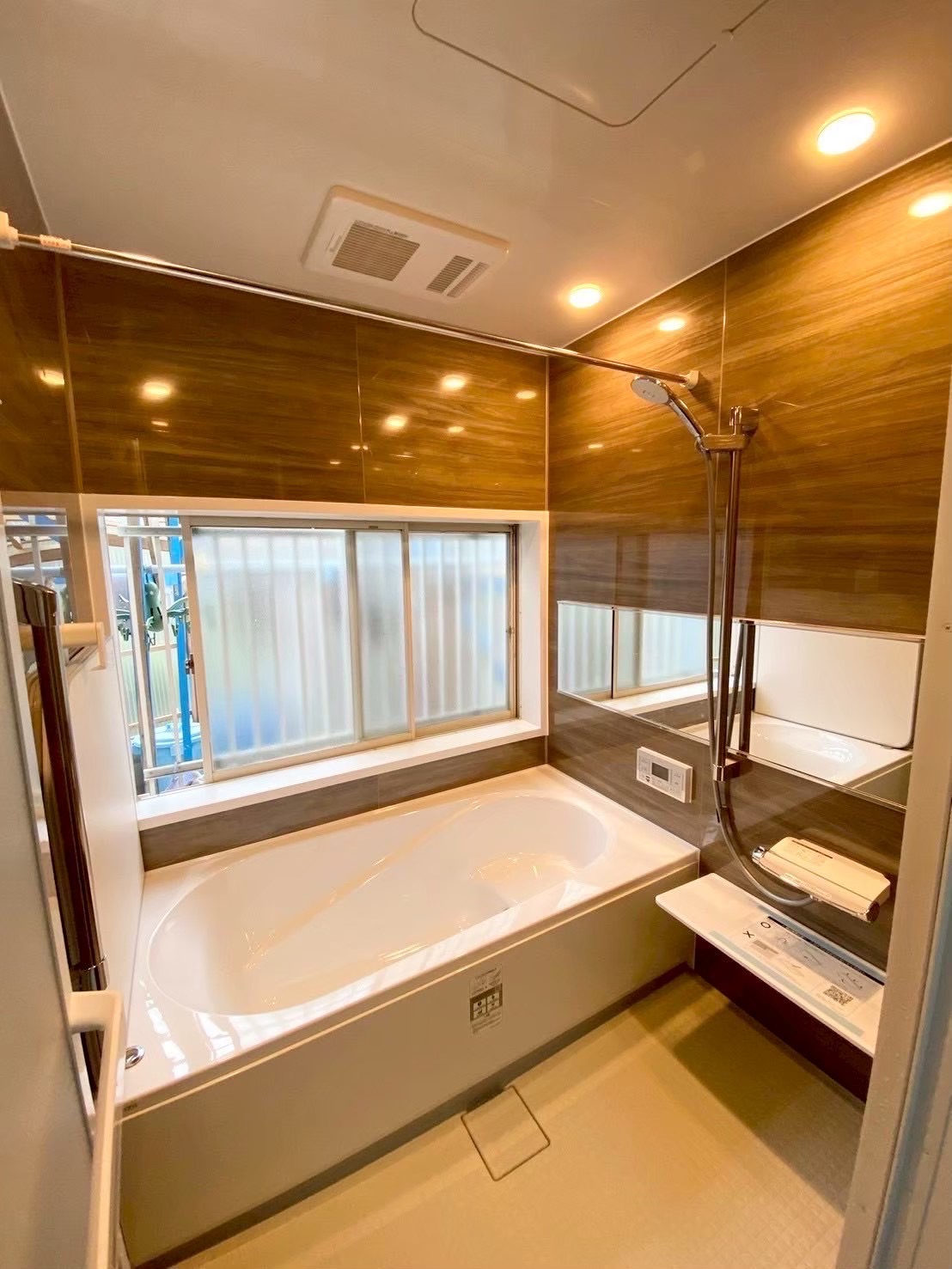 こちらはLIXIL 戸建用ユニットバス リデアになります。 壁面はウォールナット色を全面張り+電球色ダウンライト(LED)で落ち着いた雰囲気に。。。 ワイドミラーを採用することで、浴室が広く感じられ高級感も演出してくれます。